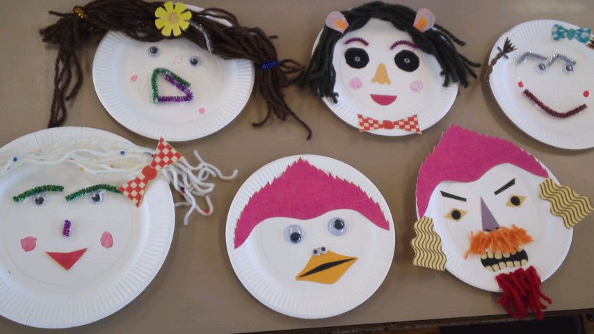 紙コップと紙皿に目、鼻、口などのパーツをつけたり