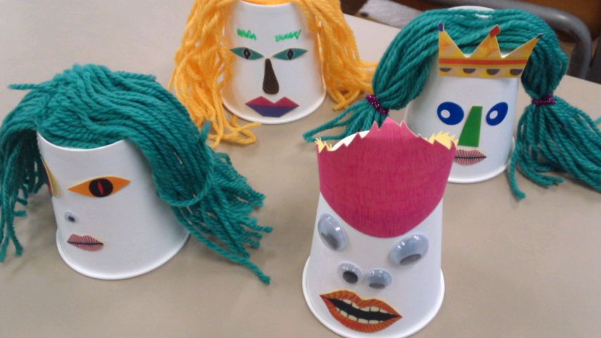 紙コップと紙皿に目、鼻、口などのパーツをつけたり